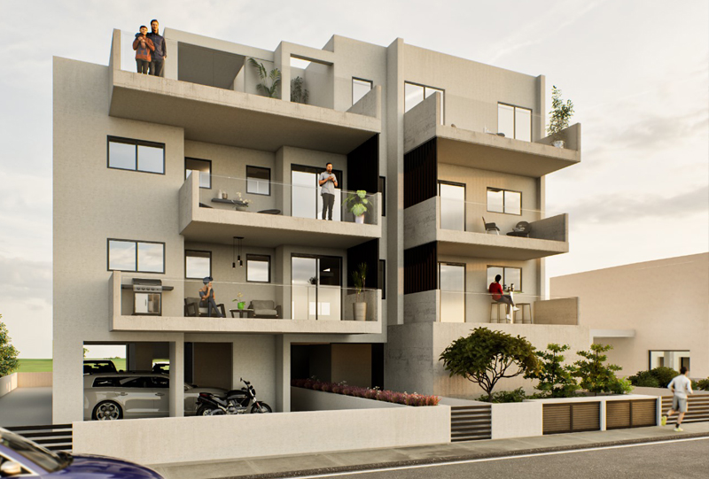 This newly completed development (2025) is located in Ypsonas, Limassol. The three-storey building, with a total area of 750 sq.m., consists of ten modern apartments — six with two bedrooms and four with one bedroom. Each apartment includes provision for split-unit air conditioning and electric heating, as well as a private storage room and a covered parking space on the ground floor. The project is designed to meet Grade A energy efficiency standards, incorporating a partial photovoltaic system. The contemporary architecture features black aluminium finishes, exposed concrete details, and elegant glass railings on the balconies.